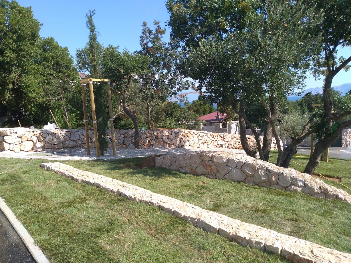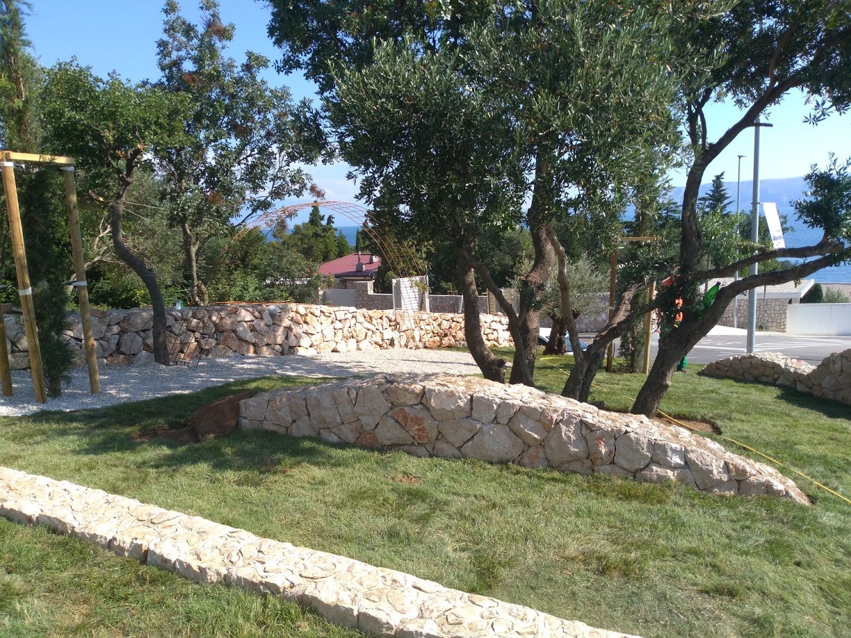 Zadržavanjem postojeće autohtone vegetacije te izborom novih vegetacijskih elemenata očuvala se veza sa izvornošću prostora ali i postigla vizualna eksponiranost, identitet i kvaliteta prostora. Prostorom dominiraju postojeća i dvije novoposađene stare masline (debla promjera cca 50 cm i 20 cm). Formom i bojom maslinama kontriraju visoki uski čempresi (Cupressus sempervirens ‘Piramisalis). Novoizvedenom travnatom plohom površine 125 m2 dominiraju zidani kameni valovi i suhozid – gromača te dva nosača za penjačice – u obliku luka i u obliku vertikalnog nosača. Pažnju na nosačima plijeniti će sljedeće penjačice: Pharthenocissus tricuspidata ‘Veichi’, Parthenocissus quinquefolia, Clematis ‘Docteur Ruppel’, Wisteria floribunda ‘Bleck Dragon’, Solanum jasminoides, Passiflora coerulea i Campsis spp. Ostale posađene biljne vrste su: Pittospoprum tobira ‘Nana’, Rhynchospremum jasminoides, Rosmarinus officinalis ‘Prostratus’ i Genista lydia. Na cijeloj uređenoj površini postavljen je sustav za automatsko navodnjavanje. Osim kamenih valova i suhozida građevinskim radovima izveden je potporni zid te postavljeni parkovni rubnjaci uz pješačku stazu.